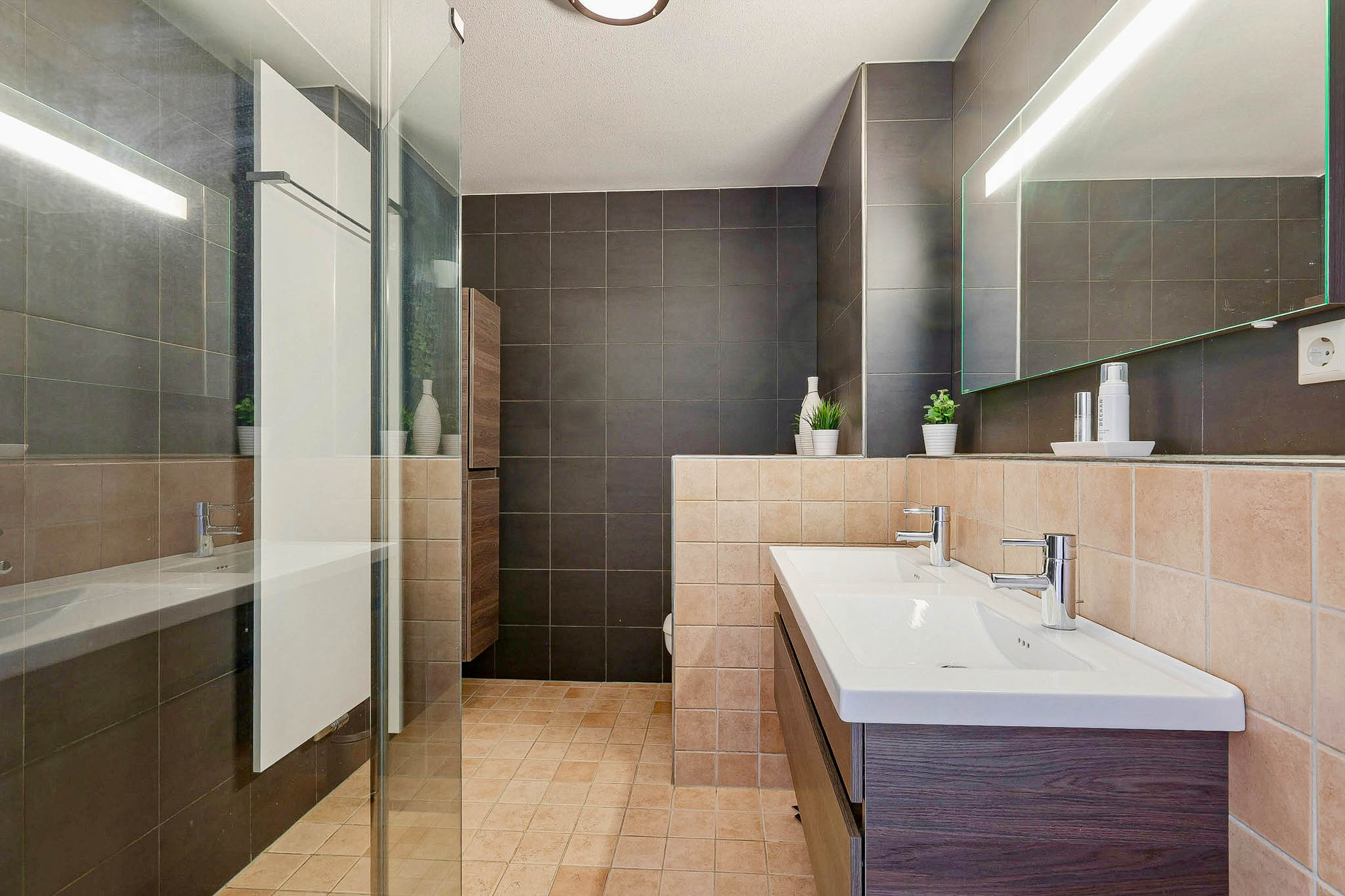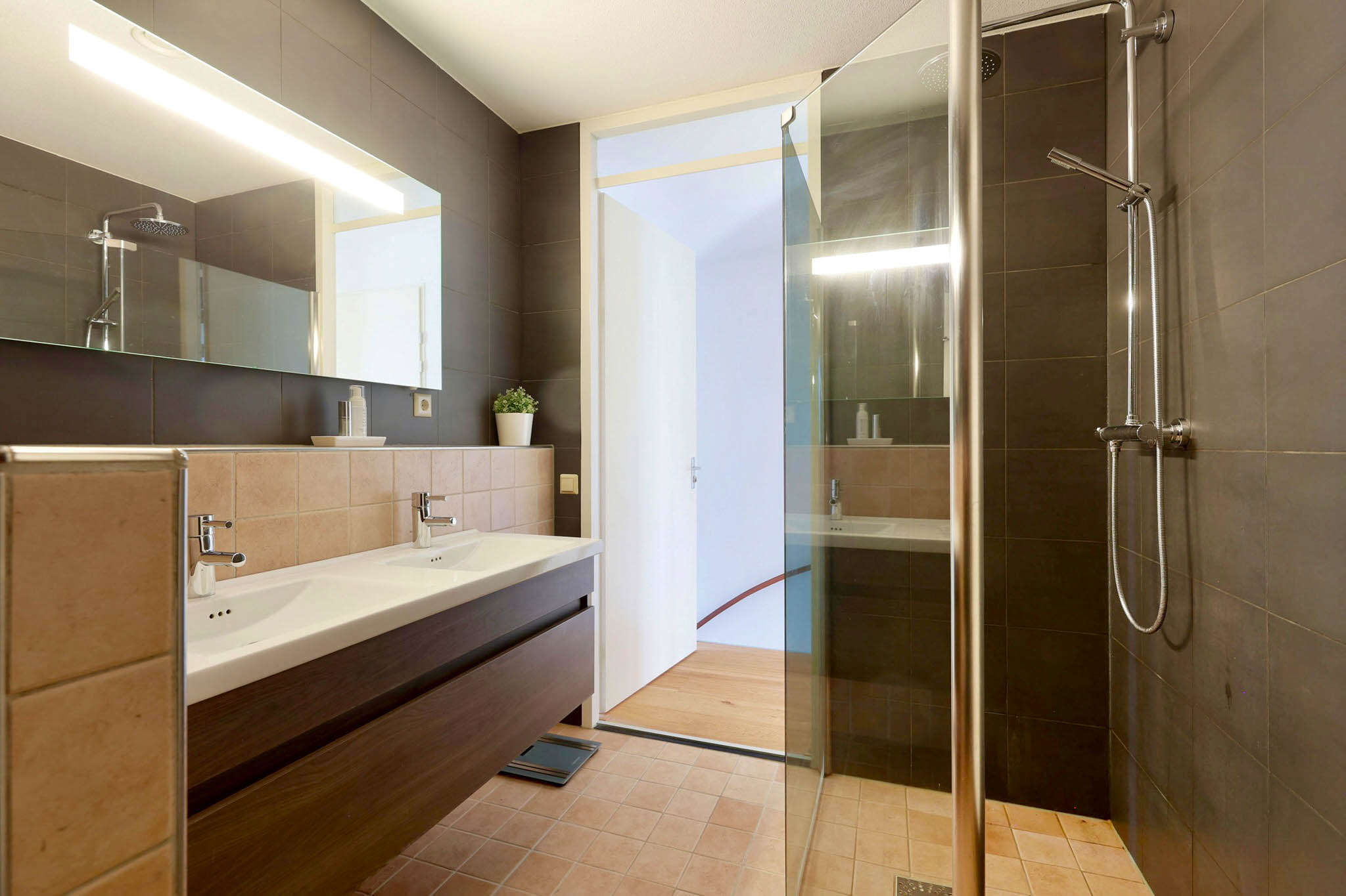 De bovenste verdieping is de plek waar je absolute rust en privacy vindt. Hier bevinden zich nog twee ruime slaapkamers, ideaal voor bijvoorbeeld een kinderkamer, logeerkamer of een luxe thuiskantoor. De comfortabele badkamer – ruim van opzet en modern afgewerkt. Douchen onder de inloopdouche met glazen wanden. Daarnaast beschikt de badkamer over een dubbele wastafel, een tweede toilet en mooie handgemaakte Italiaanse vloertegels die perfect passen bij de strakke, zwarte wandtegels.