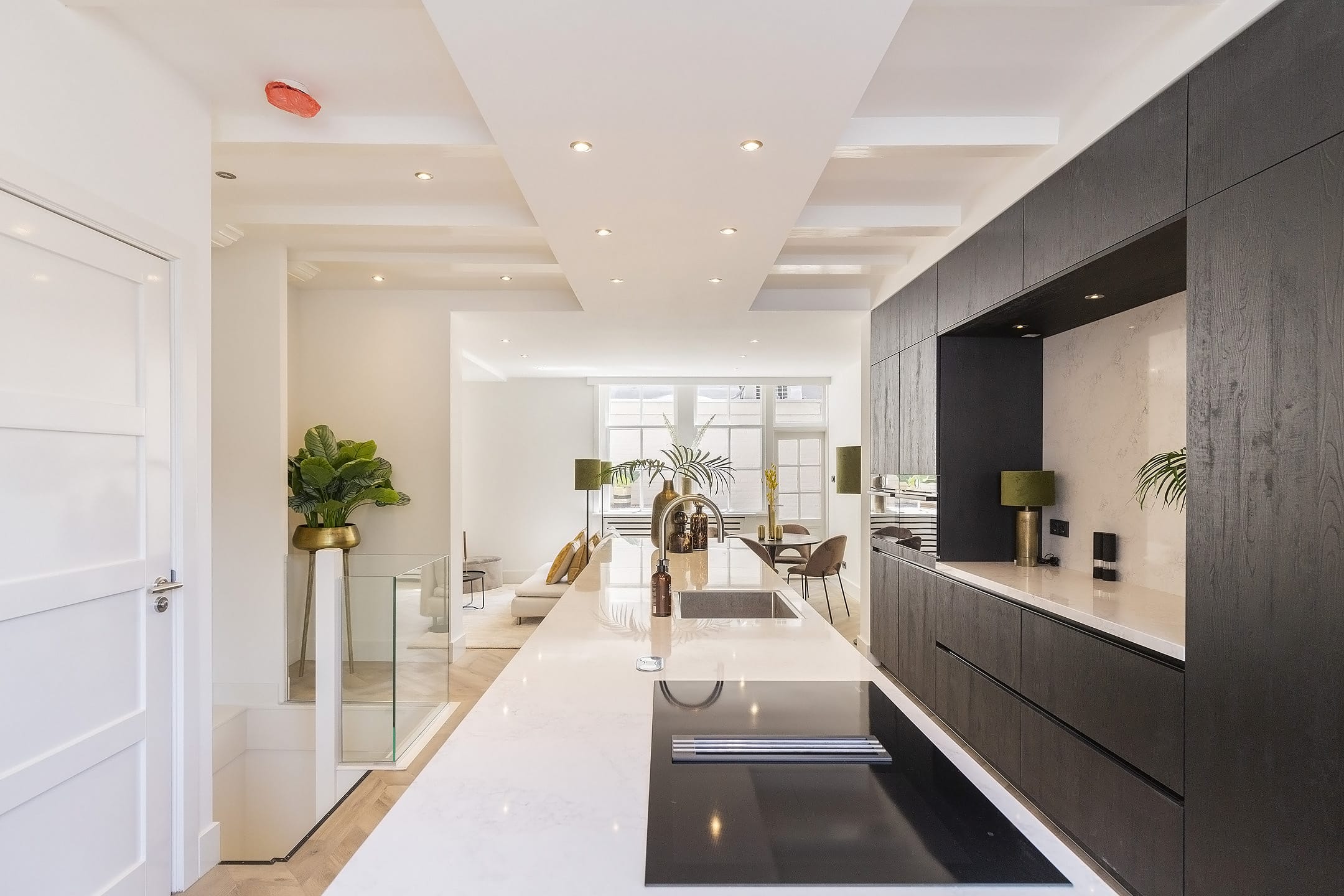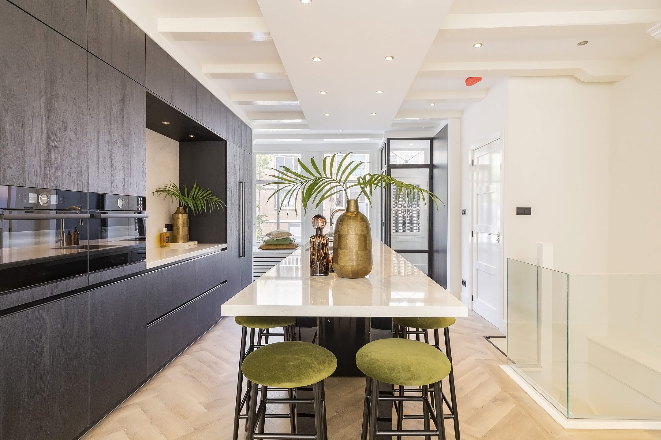 – An integrated freezer, dishwasher, microwave with steam function, multifunction oven, all from the Bosch brand. There is also a hob including Miele extractor and recirculation system, a wine refrigerator from Kuppers Busch and a Quooker.